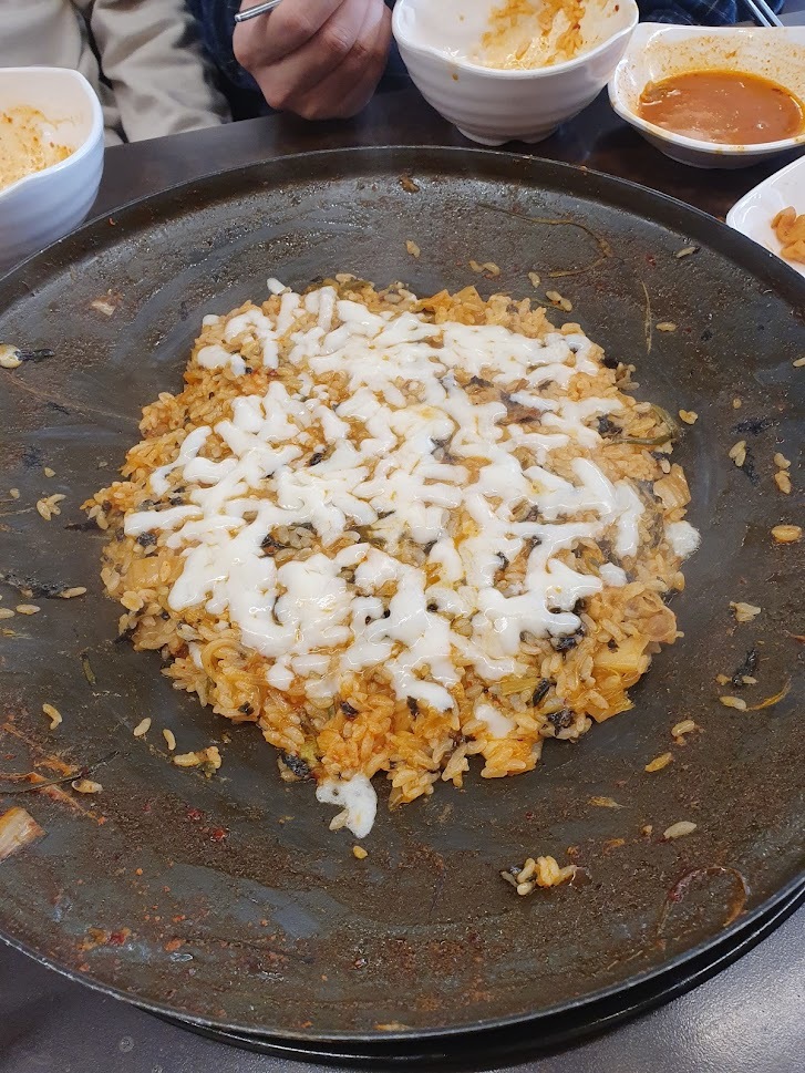 국물과 건더기를 건져 주시고 그 위에 김치와 김가루가들어간 볶음밥을 볶아 주신디. 그리고 그위에 치즈...